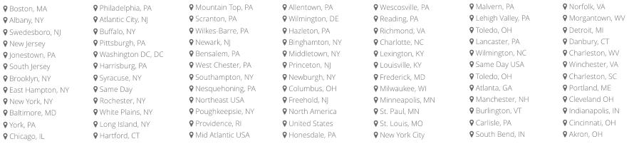 PA, Allentown PA , Philadelphia PA, Malvern PA, West Chester PA, White Plains NY, Boston MA, Hartford Ct, Danbury CT, Waterbury CT,